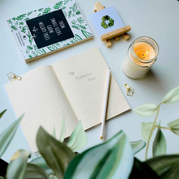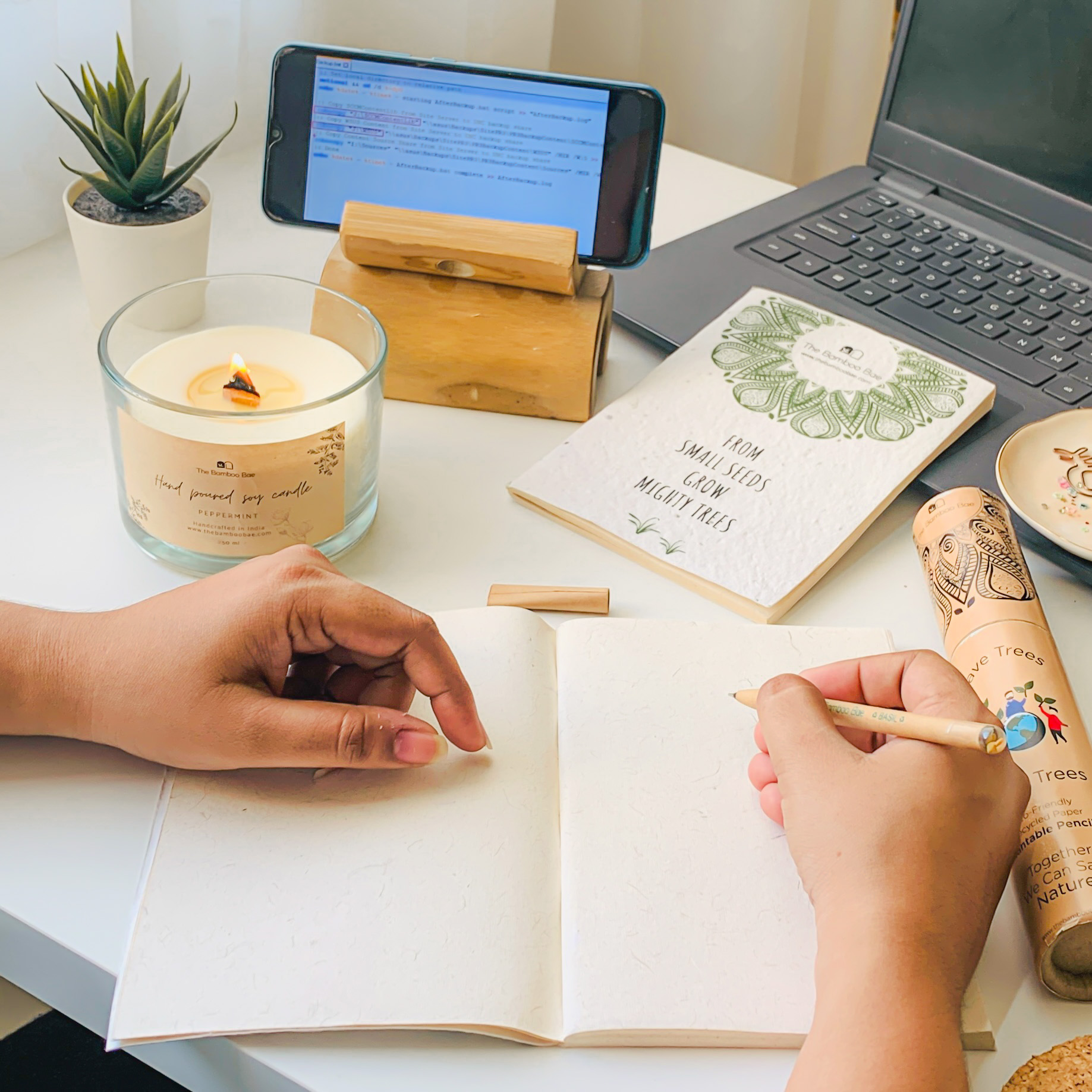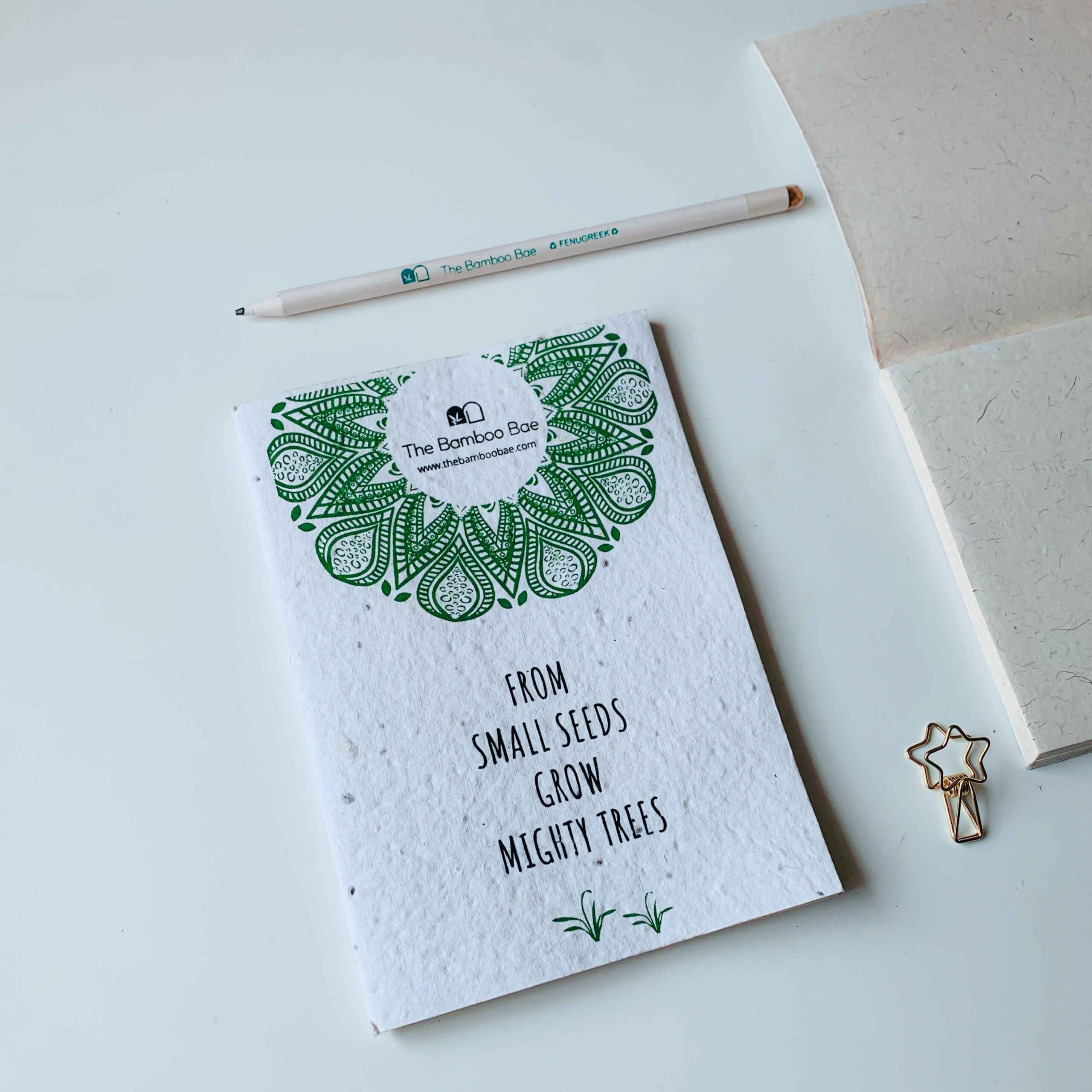This A5 plantable seed notebook has been created with hands using materials sourced locally and sustainably which is biodegradable too. The notebook cover is made from completely recycled paper and has seeds embedded in it.